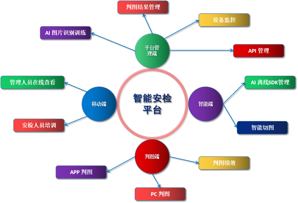 产品结合当前安检行业信息化建设的创新实践、出行安检典型经验与发展的趋势,借鉴应用互联网+、 云计算、大数据应用、物联网、移动应用、人工智能等先进的服务理念与信息通信技术,创新打造新一代智能安检平台。 涵盖X光机图像采集、图片分类学习、物体识别、安检人员培训、设备管理、安全预警、指挥中心、集中判图中心、安检线管理、辅助分析与决策等业务域, 深度融合配网生产、人员调度、公安系统等企业内部系统无缝衔接。 支撑实现信息高度共享、业务高度协同、服务便捷、管控实时在线、分析决策自动智能的现代防恐防暴安检管理管控能力。